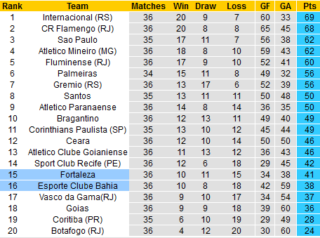 BẢNG XẾP HẠNG VĐQG Brazil