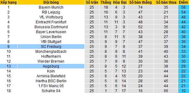 Trong khi đó Augsburg chỉ đang đứng thứ 13 của bảng xếp hạng. Mặc dù chỉ đứng trên nhóm các đội cầm đèn đỏ có 3 bậc nhưng với 29 điểm có được sau 25 vòng đấu, Augsburg đang có khoảng cách là 8 điểm với nhóm xuống hạng.