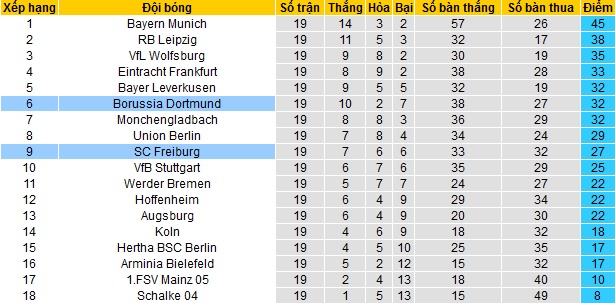 Bảng xếp hạng Bundesliga trươc vòng 20