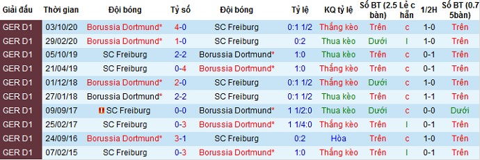 + Soi tỷ lệ kèo châu Á: Mặc dù được thi đấu trên sân nhà nhưng so về đẳng cấp Freiburg vẫn kém hơn đối thủ, thế nên họ bị đánh giá là đội cửa dưới cũng dễ hiểu. Tuy nhiên kèo chấp vẫn đang cao ở mức là -1 do Borussia Dortmund thắng tới 4 trong 5 lần gặp nhau gần nhất giữa hai đội.