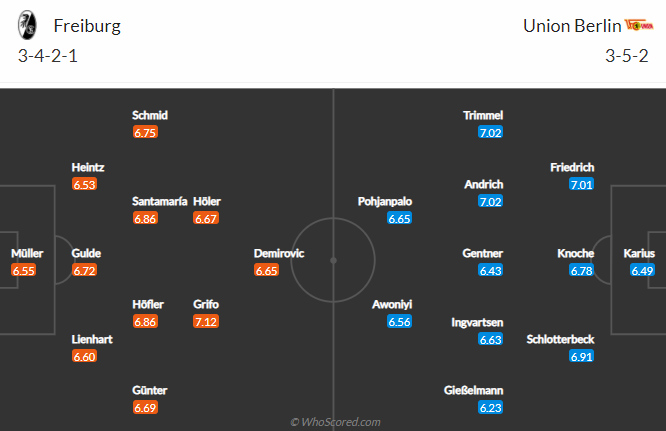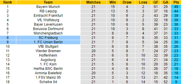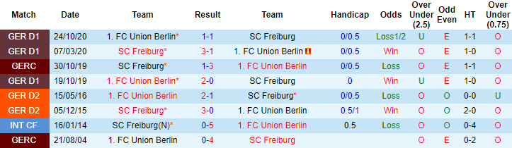 Trận đối đầu giai đoạn lượt đi giải VĐQG Đức mùa này, Freiburg đã cầm hòa Union Berlin với tỷ số 1-1 trên sân khách. Lần tái đấu sắp tới, Freiburg được tin tưởng vào khả năng giành chiến thắng khi sở hữu lợi thế về mặt sân bãi. 7 trận tiếp khách gần đây tại Bundesliga, Freiburg bất bại với 5 chiến thắng, 2 trận hòa và toàn thắng cả 7 trận theo kèo châu Á.
