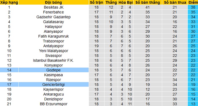 Bảng xếp hạng giải VĐQG Thổ Nhĩ Kỳ vòng 19