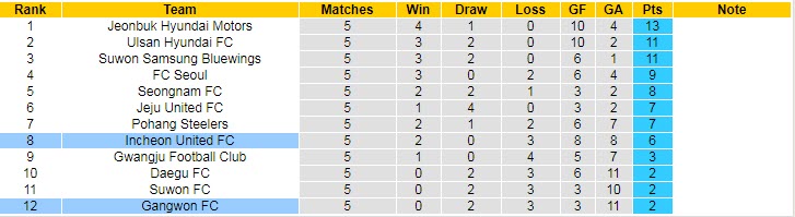 Gangwon đang cho thấy họ là một trong những ứng viên sáng giá cho suất xuống hạng của giải VĐQG Hàn Quốc mùa này. Bằng chứng, Gangwon mới có được 2 trận hòa và nhận tới 3 thất bại sau 5 lượt trận đã đá. Hiện tại, đội bóng của HLV Kim Byung-Soo đứng ở vị trí cuối cùng trên BXH.