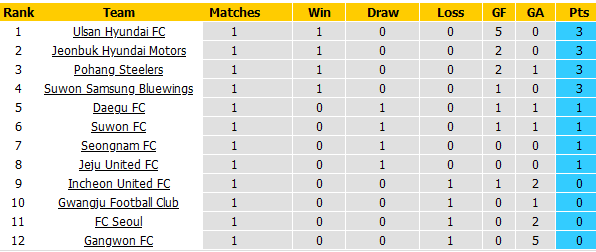 BẢNG XẾP HẠNG VĐQG Hàn Quốc