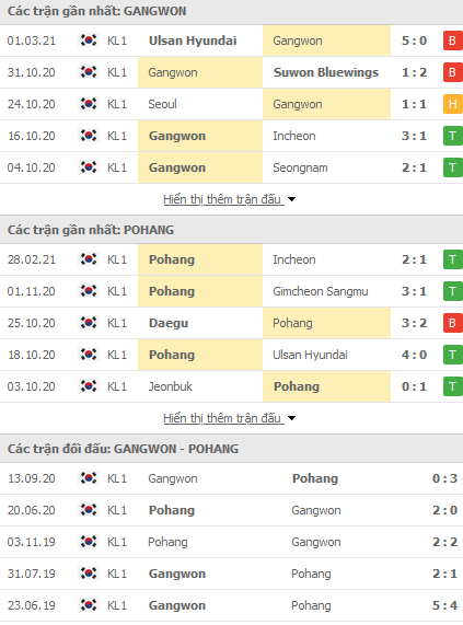 + Lịch sử đối đầu - phong độ Gangwon vs Pohang Steelers