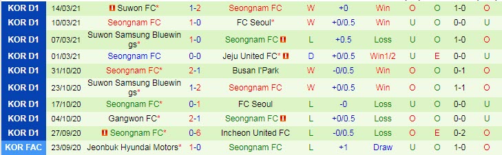 + Thống kê 10 trận gần nhất của Seongnam Ilhwa