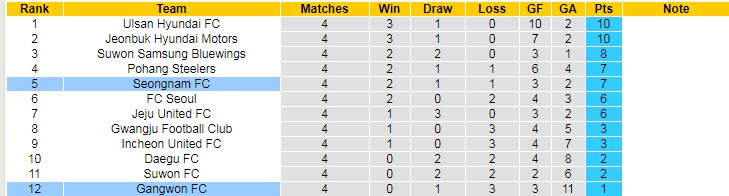 Theo đó, Gangwon là cái tên được nhắc tới với phong độ nghèo nàn. Sau 4 trận đã đá, đội bóng của HLV Kim Byung-Soo mới có được 1 trận hòa và nhận tới 3 thất bại, qua đó đứng cuối cùng trên BXH giải VĐQG Hàn Quốc.