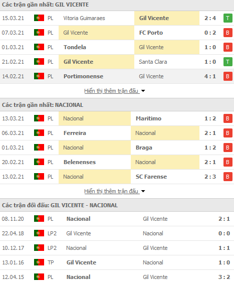 Phong độ và thống kê đối đầu gần đây Gil Vicente vs Nacional: