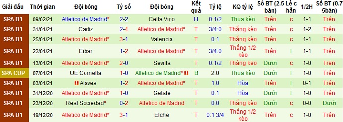 + Thống kê 10 trận gần nhất của Atletico Madrid