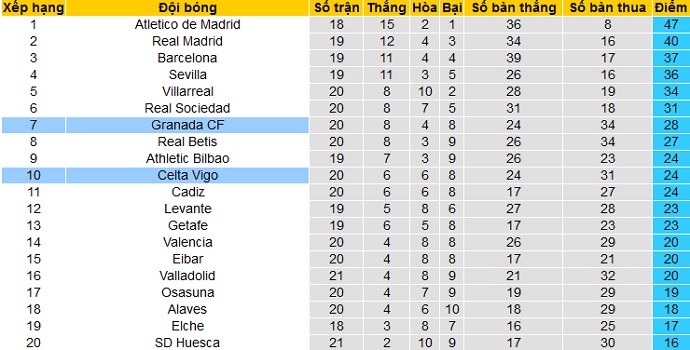 Sau 20 vòng đấu tại La Liga, Granada đã tiến sát nhóm các đội có suất dự cúp châu Âu ở vị trí thứ 7 với 28 điểm. Khoảng cách của Granada với các đội Top 6 hiện giờ đang đúng bằng 1 trận thắng.