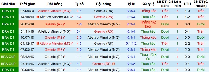 + Lịch sử đối đầu Grêmio vs Atlético Mineiro