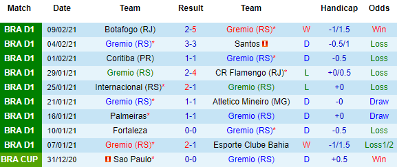 + Thống kê 10 trận gần nhất của Gremio