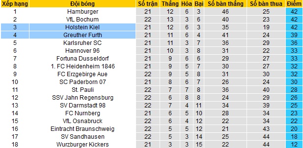 Trong khi đó Holstein Kiel vẫn đang thể hiện phong độ rất tốt trong mùa bóng này. Nếu như ở mùa trước Holstein Kiel chỉ về đích ở vị trí thứ 11 thì hiện tại đội bóng đã vươn lên vị trí thứ ba với 42 điểm cũng sau 21 vòng đấu. Hiện Holstein Kiel đang có cùng bằng điểm với 2 đội đầu bảng và xếp sau do kém về hiệu số bàn thắng.