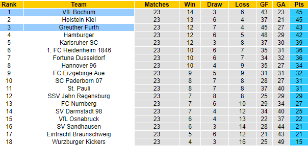Nếu như Greuther Furth đang có vị trí thứ 3 thì Bochum dẫn đầu giải, đôi bên đều rộng cửa tranh chấp suất thăng hạng trực tiếp. Dù vậy thì cách biệt giữa các đội ở nhóm đầu là không lớn, và một kết quả thất vọng có thể khiến đôi bên đánh mất vị trí hiện tại của mình.