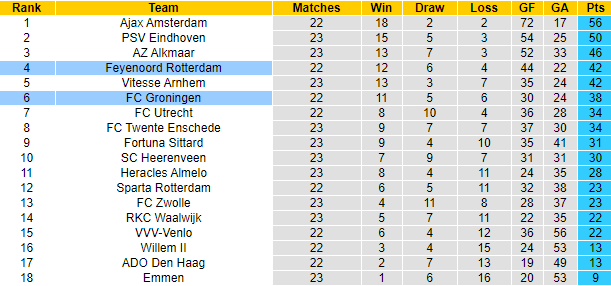 Ngược lại, Feyenoord lại đang liên tục gây thất vọng ở các chuyến làm khách. 4 trận xa nhà vừa qua tính trên mọi đấu trường, Feyenoord bất thắng với 3 thất bại và 1 trận hoà. Lực lượng sứt mẻ với danh sách chấn thương lên tới 4 cầu thủ, Feyenoord khó thi đấu khởi sắc trong chuyến làm khách đến Groningen.