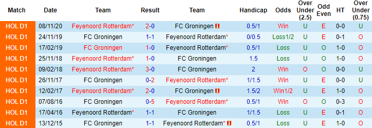 Những mùa giải gần đây Feyenoord luôn có được kết quả thuận lợi khi đối đầu Groningen. Đơn cử như 8 lần chạm trán Groningen từ năm 2016 đến nay trong khuôn khổ giải VĐQG Hà Lan, Feyenoord bất bại 7 lần với 6 chiến thắng và 1 trận hoà.