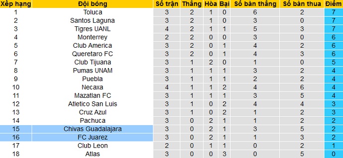 Bảng xếp hạng giải VĐQG Mexico vòng 4