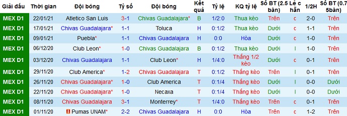 + Thống kê 10 trận gần nhất của Guadalajara
