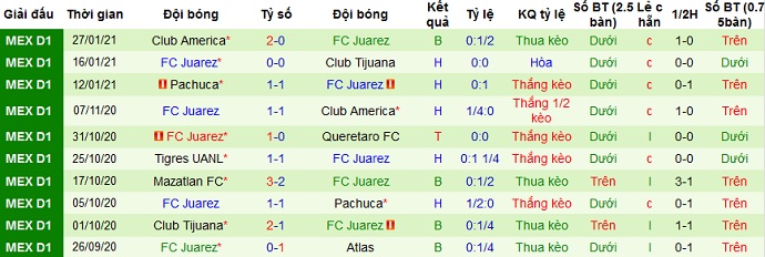 Với Juárez, thành tích 5 trận gần đây của đội bóng cũng chẳng tốt hơn là bao với 1 trận thắng, 3 trận hòa và 1 trận thua tính cả các trận ở lượt đi. Trên sân khách Juárez cũng đang có phong độ khá tệ với 2 trận hòa và 3 trận thua ở 5 lần du đấu gần nhất.