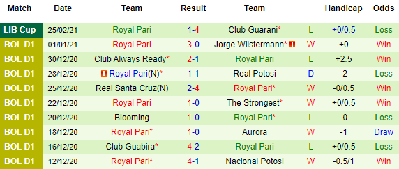 Dù là cái tên không hề yếu ở Bolivia nhưng khi ra đấu trường cấp châu lục, Royal Pari bộc lộ sự yếu kém. Thảm bại tới 1-4 ở lượt đi ngay trên sân nhà cho thấy giữa Royal Pari và đối thủ có sự khác biệt rất lớn về đẳng cấp. Cơ hội cho Royal Pari lật ngược tình thế gần như không có.