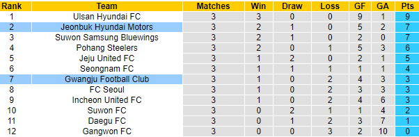 Lẽ dĩ nhiên là Jeonbuk Hyundai hướng đến một vị trí trong top đầu, để có lợi thế khi bước vào giai đoạn 2. Sau 3 vòng đấu, Jeonbuk Hyundai có 7 điểm và tạm thời xếp thứ 2 sau Ulsan Hyundai – đội duy nhất toàn thắng tính đến lúc này. Trong khi đó thì Gwangju thi đấu chưa thực sự ấn tượng từ đầu mùa.