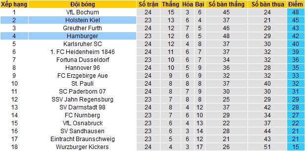 Trái lại Holstein Kiel vẫn giữ được phong độ khá tốt khi tiếp tục đứng thứ nhì trên bảng xếp hạng. Với 45 điểm có được sau 23 vòng đấu, Holstein Kiel đang kém đội đầu bảng Bochum 3 điểm cũng như có nhiều hơn đội thứ ba Greuther Fürth 2 điểm nhưng đang thi đấu ít hơn 1 trận.