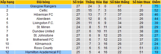 Trái lại Rangers đang độc chiếm ngôi đầu bảng xếp hạng với 75 điểm sau 27 vòng đấu. Hiện tại Rangers đang bỏ xa đội thứ nhì, đồng thời cũng là đại kình địch Celtic tới 20 điểm mặc dù Rangers đã thi đấu nhiều hơn 1 trận. Tuy nhiên ngôi vô địch sẽ chỉ được quyết định sau các trận đấu ở giai đoạn 2.