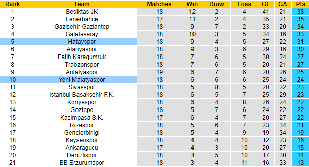 Trận đấu sắp tới được chơi trên sân nhà, Hatayspor hứa hẹn vào khả năng giành chiến thắng. 20 lần tiếp khách trước đây tính trên mọi đấu trường, Hatayspor bất bại 18 trận (thắng 12, hòa 6). Trong khi đó Yeni Malatyaspor đang xếp thứ 10 trên bảng xếp hạng với 24 điểm lại luôn gây thất vọng trên sân khách (thua 6, hòa 3 trong vòng 10 trận xa nhà vừa qua).