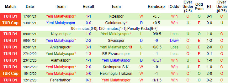 + Thống kê 10 trận gần nhất của Yeni Malatyaspor