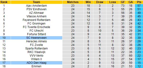 Phía bên đối diện, ADO Den Haag đang rơi vào cảnh khó khăn và khả năng họ phải xuống hạng là không nhỏ. ADO Den Haag hiện xếp áp chót, kém vị trí an toàn 7 điểm, kém đối thủ được đá play-off chống xuống hạng phía trên 2 điểm. Mục tiêu khả dĩ với ADO Den Haag là chiếm lấy vị trí đá play-off đó.