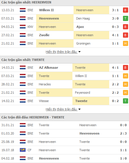 Phong độ và thống kê đối đầu gần đây Heerenveen vs Twente:
