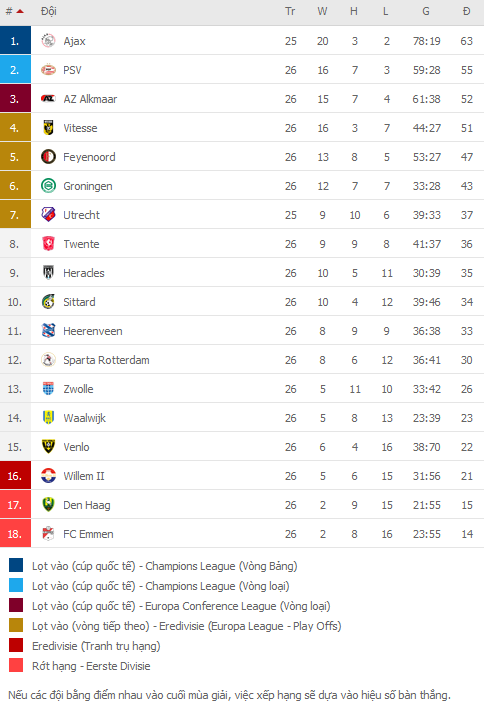 BẢNG XẾP HẠNG VĐQG Hà Lan