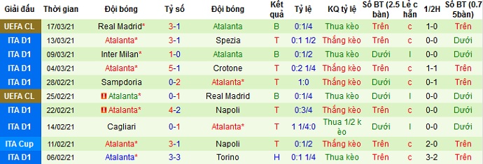 Trong 5 trận đấu gần đây Atalanta có được 3 trận thắng, để thua 2 trận. Cả 2 trận thua của Atalanta đều diễn ra trên sân khách trước các đội bóng mạnh là Inter Milan và Real Madrid, đồng thời đội bóng cũng đã chấm dứt cuộc phiêu lưu tại cúp châu Âu mùa này.