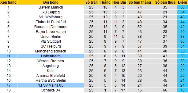 Trong khi đó Mainz 05 vẫn đang phải vật lộn ở vị trí áp chót bảng xếp hạng. Sau 25 vòng đấu Mainz 05 mới có được 21 điểm, bằng điểm với đội đứng trên Hertha Berlin nhưng cũng chỉ kém nhóm các đội trụ hạng đúng 1 điểm.