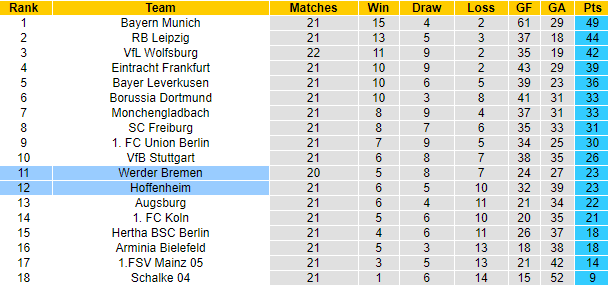Phong độ và thống kê đối đầu Hoffenheim vs Werder Bremen