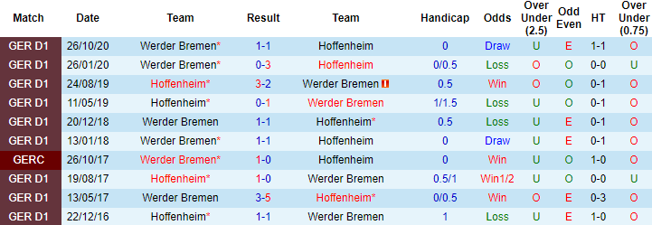+ Lịch sử đối đầu Hoffenheim vs Werder Bremen