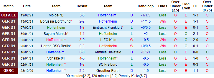 Hoffenheim bất bại cả 3 trận đối đầu Bremen gần đây với 2 chiến thắng và 1 trận hoà. Tuy nhiên ở lần tái đấu sắp tới, Hoffenheim vẫn không được tin tưởng vào khả năng giành chiến thắng dù có lợi thế sân nhà. Giai đoạn gần đây Hoffenheim thực sự gây thất vọng với 3 trận liên tiếp không biết mùi chiến thắng. Rạng sáng 19/2 vừa qua, Hoffenheim bị Molde cầm hoà 3-3 tại Europa League.