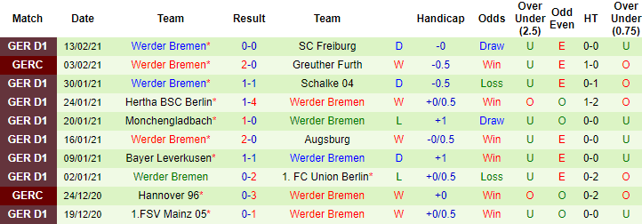 + Thống kê 10 trận gần nhất của Werder Bremen