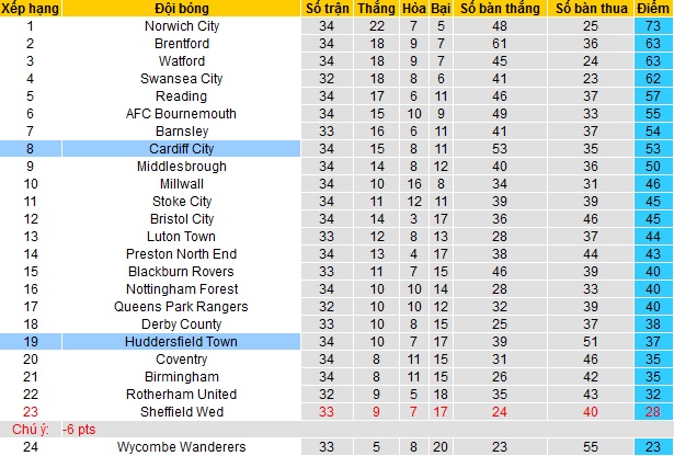 Sau 34 vòng đấu tại giải hạng nhất Anh, Huddersfield mới có được 37 điểm và chỉ đứng thứ 19 trên bảng xếp hạng. Hiện tại đội bóng đang đứng trên nhóm cầm đèn đỏ 3 bậc với khoảng cách chỉ còn là 5 điểm.