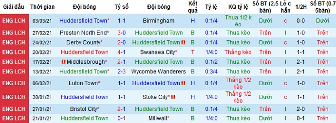 + Thống kê 10 trận gần nhất của Huddersfield