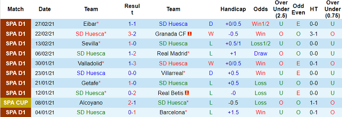 - Thống kê 10 trận gần nhất của Huesca