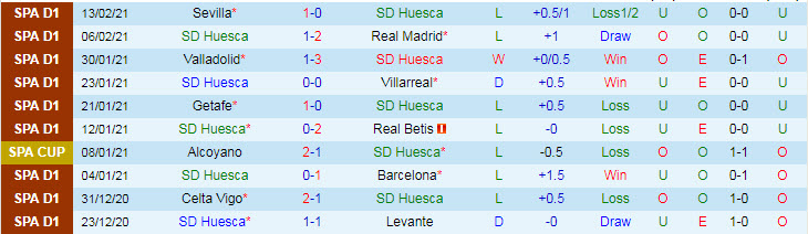 + Thống kê 10 trận gần nhất của Huesca