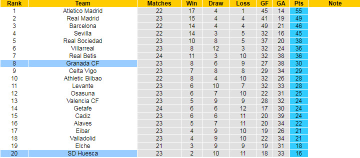 Với kết quả trên, đội bóng của HLV Pacheta vẫn dậm chân ở vị trí cuối bảng khi có 16 điểm sau 23 lượt trận. Lúc này, Huesca đã kém nhóm an toàn tới 5 điểm và mọi trận đấu còn lại đều được xem là những trận chung kêt sống còn đối với họ.
