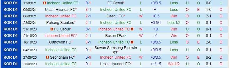 + Thống kê 10 trận gần nhất của Incheon