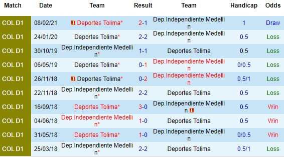 + Lịch sử đối đầu Independiente Medellin vs Deportes Tolima