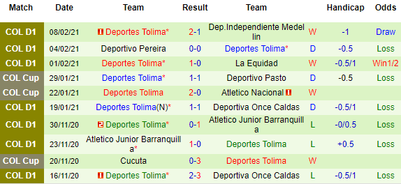 + Thống kê 10 trận gần nhất của Deportes Tolima