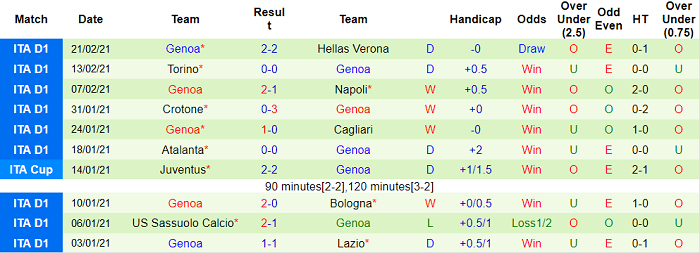 Genoa thời gian gần đây thường xuyên giành được những kết quả tích cực. Họ bất bại cả 7 vòng gần nhất và thu về 15/21 điểm tối đa. Thành tích này ấn tượng hơn đáng kể so với việc chỉ sở hữu 11 điểm từ 16 vòng đấu đầu tiên của Serie A 2020/21.