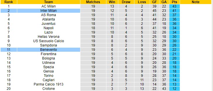 Trái ngược với tâm thế tự tin của đối thủ, Benevento khiến nhiều người yêu mến bất an khi sở hữu phong độ chồi sụt. Cụ thể, họ chỉ thắng 1 trận, hòa 1 và thua 3 trong số 5 trận gần nhất tại giải VĐQG Italia. Một điểm cần lưu ý, Benevento vừa để thua cả 4 trận đối đấu trước Inter và không dễ để họ có điểm ở trận đấu đêm nay.