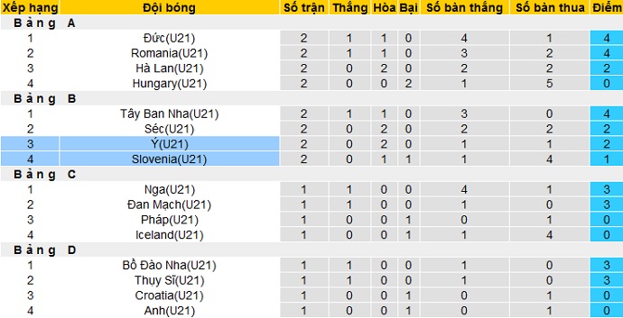 Bảng xếp hạng EURO U21 vòng 2