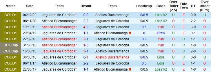 Phong độ và thống kê đối đầu Jaguares Cordoba vs Bucaramanga